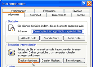 wat heemlich op SeEhr Fastplatt schrieven dröff, un ok wieldat so utspikeleert warrn kann, woneem Se surft usw. (Datenschuul). Naja. Mehrst sünd Cookies avers harmlos. Wüllt Se Cookies löschen, denn wählt Se in'n Internet Explorer Menü Extras | Internetoptionen, Registerkoort Allgemein, Knoop Cookies löschen. Denn kaamt avers later wedder niege Cookies dorto.