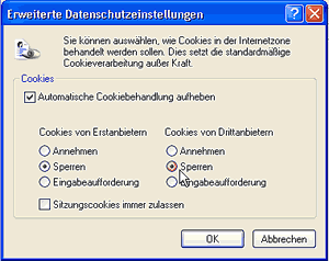 Wüllt Se de Cookies een för alle Maal verbeden, denn wählt Se in'n Internet Explorer Menü Extras | Internetoptionen, Registerkoort Datenschutz, Knoop Erweitert. In den lütten Dialoog, de denn kümmt, stellt Se allens so in as in düt Bild.