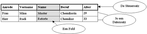 De vullstännige Informaschoon över en Element in en Datenbank. Jedeen Minsch ok Se un ik is bi mennig Steden Behörden, Firmen usw. in Datenbanken as Datensatz verewigt. Dat mööt avers nich Minschen ween; in de Datenbank över Boote, de baven afbildt is, is elkeen Boot en Datensatz. Mehrst warrt de Datensätz as Reegn vun Tabelln weddergeven.