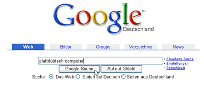 Warrt "Gugel" utspraken. En Söökmaschien (un twoors opstunns 3.Quartal 04 de bekannteste). Is ünner de URL www.google.de (op Hoochdüütsch) to kriegen, is ümsüss, heel licht to bruken un gifft gode Ergeevnissen.