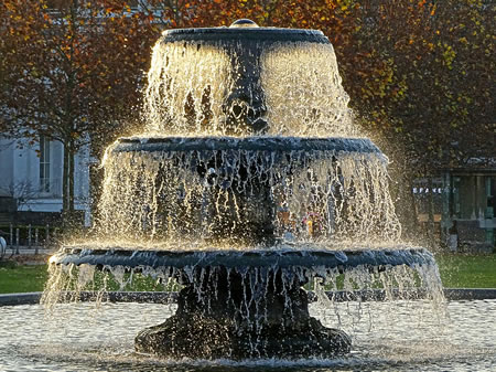 Un nu seggt uns Leed uns: Allens dat kümmt vun Gott. Dat will bloots dör uns Hannen lopen, dat de Welt wieder wassen un diegen kann. "Es geht durch unsre Hände, kommt aber her von Gott." Dat heet: Dat will nich in uns Hannen liggen blieven! Ok op uns Konto will dat nich liggen blieven, un al gor nich in uns Weertpapeer-Portfolio. Allens kümmt vun Gott, un dat heet: Dat höört uns gornich to. Wenn wi empfangen wüllt, mööt wi de Hannen apen hollen un mit liekso apen Hannen schallt wi dat wiedergeven. Wenn wi dat wiedergeevt wenn wi wat schenkt orr spendt , denn kümmt dat gor nich vun uns. Dat kümmt vun Gott. Un de Minsch orr de Organisaschoon, de wi beschenkt orr de wi en Spenn tostüürt, mutt sik nich bi uns bedanken veelmehr dröfft wi all uns an desülvige Adress bedanken. Ja, wi dröfft ok dorför danken, dat wi wiedergeven köönt! Hier schuuvt sik en Bild in mien Gedanken: dat schöne Gedicht "De röömsche Brunnen" vun C.F. Meyer, dat ik hier översetten do: