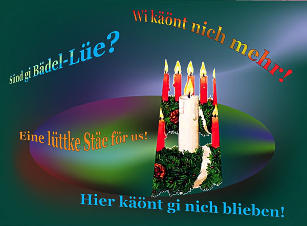 Och, maokt doch dei Dörn för us aopen! Leiwe Frönde, wi sünd arm, häbbt ein gauet Harte, wi bruukt blots eine lüttke Stäe achtertau.
