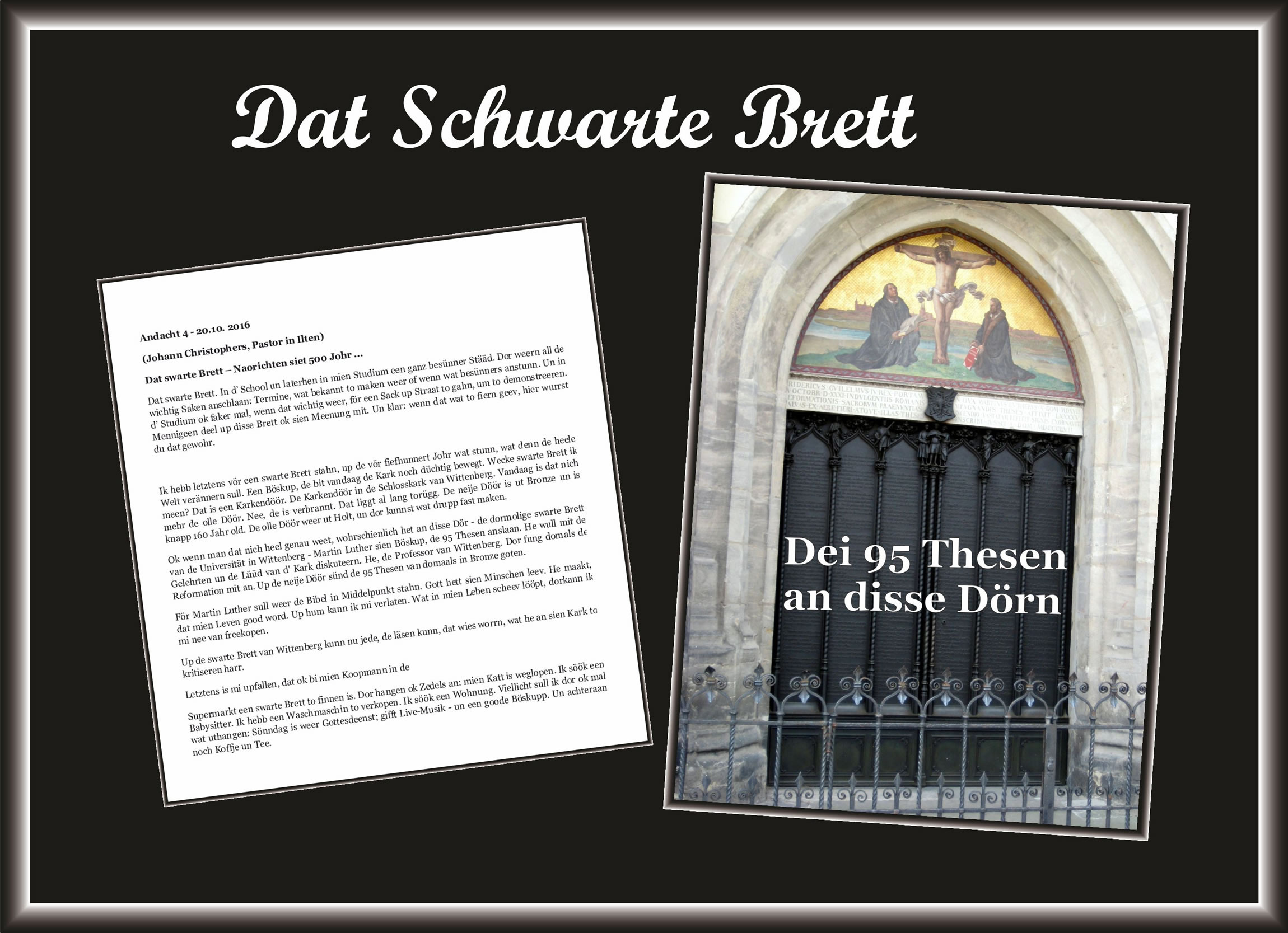 Ok wenn man dat nich heel genau weet, wohrschienlich het an disse Dör de dormolige swarte Brett van de Universität in Wittenberg Martin Luther sien Böskup, de 95 Thesen anslaan. He wull mit de Gelehrten un de Lüüd van d' Kark diskuteern. He, de Professor van Wittenberg. Dor fung domals de Reformation mit an. Up de neije Döör sünd de 95 Thesen van domaals in Bronze goten. För Martin Luther sull weer de Bibel in Middelpunkt stahn. Gott hett sien Minschen leev. He maakt, dat mien Leven good word. Up hum kann ik mi verlaten. Wat in mien Leben scheev lööpt, dorkann ik mi nee van freekopen. Up de swarte Brett van Wittenberg kunn nu jede, de läsen kunn,