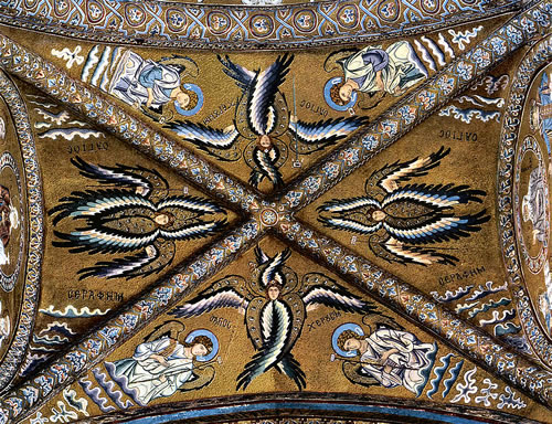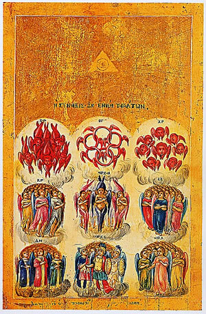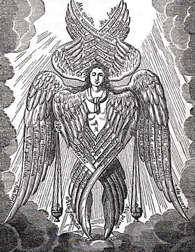 Un dat geiht noch wieder, wat dei Ordnung inn Häben angeiht. Dei Engels knen nich all dörcheinanner den leiwen Gott ümgäben, sonnern sei sünd as sien Soldaten in Schoren indeilt. Un so sünd sei ünnereinanner nich all gliek un hemm ok nich all datsülwig tau daun. Dei mirsten Engels hemm keinen Nåmen; ein Utnåhm sünd dei drei Irzengels: Gabriel, Rafael un Michael. All dei annern warkeln rümmer. Inne ierste Reich, gliek ganz dicht näben Gott, sünd dei Seraphim tau finnen. So'n Seraph ("Seraphim" is dei Plural) ward as n Wäsen mit söss Flgel målt un schlächt mihr nån Draken as nån Engel. Twei Flüchten höllt hei sik vört Gesicht, mit twei Flüchten deckt hei sik dei Fäut af, mit dei twei annern flücht hei un höllt dorbi inne Hänn gläunig Kåhlen, dei as Blitzen vonn Häben lüchten. Ut dissen Grund heitens ok dei Gläunigen. Näben dei Seraphim ståhn dei Cherubim von gliek hogen Rang. Gott hett sei för besonnere Upgåben insett, taun Bispill as Uppasser fört Dur vonn Gorn Eden, nådem Adam un Eva sik dor versünnigt harrn. Sei gellen as dei Klauken un sünd vont Utseihn her wull bäten minschenähnlicher utfollen as dei Seraphim. Upn glieken Rang as dei Seraphim un Cherubim ståhn noch dei Throne as drüdde Schor von Engels. Dei Seraphim, Cherubim un Throne sünd tausåmen dei Beråder vonn leiwen Gott. Upn tweiten Rang finnen wi wedder drei Schoren von Engels; sei sünd dei Verwalter inn Häben. Un upn drüdden Rang finnen wi noch drei anner Schoren as Apportendräger inn Häben. Ein Schor in dissen Rang sünd dei Ärzengels, ein anner Schor dei Schutzengels. All Engels up dissen ünnersten Rang sallen as böbelste Engels den spirtuellen Kontakt twischen Gott un den Minschen knüppen knen. Un ünner disse böbelsten Engels is Michael sihr bekannt, hei ward an meisten verihrt, dor hei alle annern Engels vörangeiht. Matthäus schrifft in sien Evangelium (28, 1-6), datn Engel inn witt Kleed mitn Ierdbäben vonn Häben keem un verkünnen däd, dat Jesus, dei ant Krüz någelt wür, nich miht int Graff licht, sonnern uperståhn is. Von dorher ward ok annåhmen, dat uns Minschen disse Schor von Engels, vonne Flüchten mål afseihn, ann neechsten kümmt.