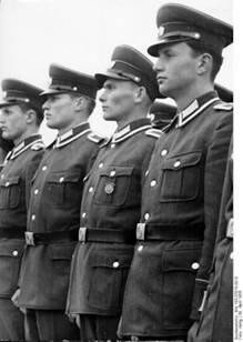 Ik weet dat bit hüüt nich, wokeen de Tschakos raupen hett. Sei wiern door. Söss Vopos mit Karabiner op den Mannschaftstransportwagen. Uns Deerendoktor weer ok op den Hoff in den Swienstall. Hei hett