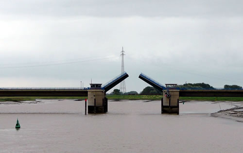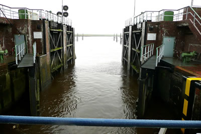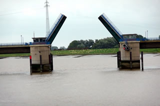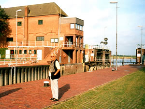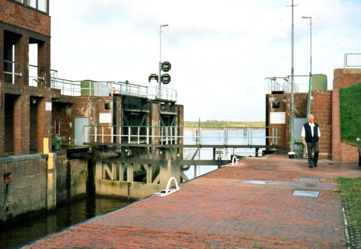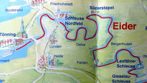 Dat Weder harr sik in de Twischentied watt beruhigt. De Regen harr nalaten. De noch brede "Tiden-Eider" slängel sik dörch de Masch. To rechte Hand leeg Dithmarschen un to linke Siet Nordfreesland. Wi nähern uns de Slüüs Nordfeld. Ik weer al bannig neeschierig. De Slüsenkamer weer teemlich small un de Adler Princess weer nich jüüst slank. De Kaptein hett uns vör de Affohrt vertellt, dat dütt Schipp extra för de Fohrt up de Eider von dat Waterstratenamt Tönning tolaten weer.