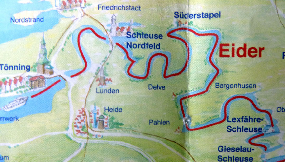 Al vör eenige Johr'n weern mien Mann un ik för en poor Daag in Süderstapel. Wi wullen uns den Övergang vun de Geest to de Masch wat genauer ankieken. De Geestrüüch weer dor 15 Meter höger as de Eider. Bi Storm güng de Nordsee bit an den Geestrüüch. Vun uns Gasthuus in Süderstapel kunnen wi wunnerbor up de Eider kieken. Dor hebbt wi al en Fohrgastschipp up de Eider sehn. Uns Plan för en Eiderfohrt stünn fast. Vun Süderstapel hebbt wi noch eenige Fohrten in't Land maakt. De lütte Oort Drage harr mi dat andahn. "Wat wullt du dor?", wull mien Mann weten. Dor heff ik em vun de Buurnglock vertellt. De wöör insett, wenn för dat Dörp en Gefohr bestünn. De Stapelholmer un de Dithmarscher weern sik nich gröön. De Dithmarscher fullen in't Land, röverten un setten Buurnhöff in Brand. Dat weer en slimme Tiet. Lütt Stück wieder kemen wi denn wedder bi Regen mit uns Schipp an de Eiderslüüs Nordfeld. De weer siet 1936 in Betrieb. Se sull de Binneneider vör Hochwater un vör Sturmfloten afsichern. Bit to de Tiet weer de Tidenhub mit 1 Meter noch bit Rendsborg to spören.
