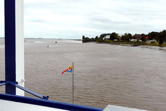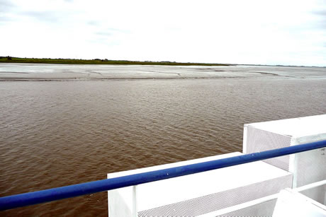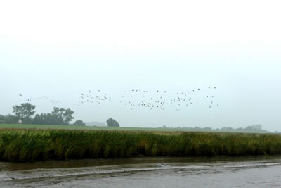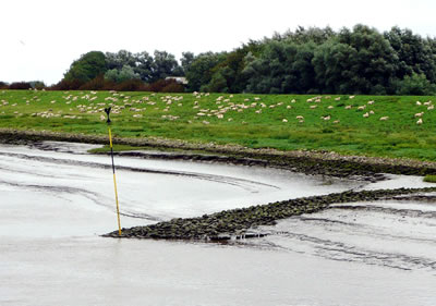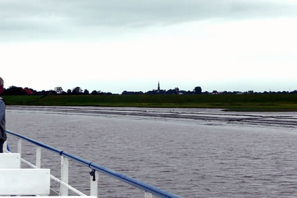 Seker stüür de "Adler Princess" dörch de apen Brüüch un uns Fohrt güng wieder in Richt na Rendsborg. Rechts un links vun uns swappen de Wellen gegen dat Över. Hier harr de Eider noch enen richtigen Diek. Up den Diek grasen de Schaap (lebennig Rasenmeiher). An Heven trocken mit Gesnatter Graugöös neven uns ehr Bahn. Achter uns verswunn in den griesen Heven de Kirchturm vun Tönning.