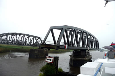 Mit luut Klingeln weck mi de Wecker. Gau sprung ik ut Bett un leep an't Finster. Dat weer noch gor nich richtig hell. Aver de Regendruppen an de Finsterschiev weern nich to översehn. Dat hölp nu allens nix, ik müss los! Villicht änner sik dat Weder noch up de Busfohrt bit Tönning. Klock 10 sull de "Adler Princess II" vun de Eiderkaje in Tönning afleggen. Ümmer wedder güng mien Blick wiel de Busfohrt ut Finster. Aver de Regen prassel so dull gegen de Schieven, kuum dat de Wischer för den Busfohrer enen kloren Utblick beschick! Wat en Glück, dat ik enen Scheerm dorbi harr. In Tönning leet de Regen wat na. Wi kemen dröög an Bord. De Motor vun de "Adler Princess" leep al, un as wi all an Bord weern, leggte de "Adler Princess" to uns Eiderfohrt af. De Sicht weer nich allto goot. Rechts un links an't Över weer griesen Slick; Watt, as dat an de Noordsee heet. Vör uns leeg de eerst Brüüch över de Eider. De harr ehr Klappen al för uns upmaakt.
