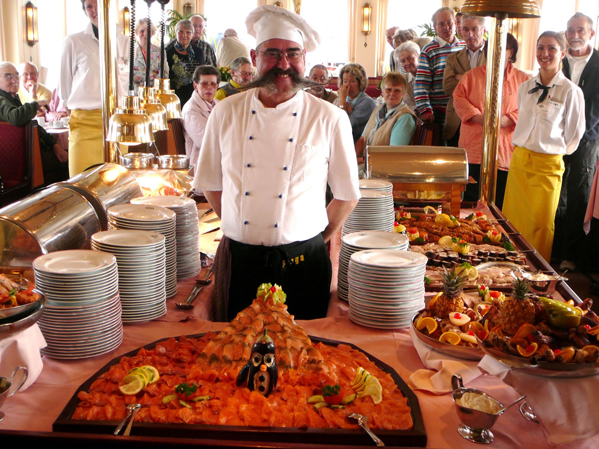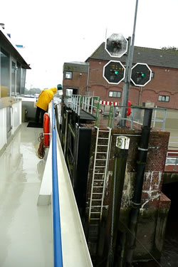 De Slüüs vun Nordfeld harr blots een Kamer vun 65 Meter Länge. De Breede weer blots 9,50 Meter. Dor sull nu de "Adler Princess" dörch! Se hett dat aver mit Hölp vun de Schippskru schafft. In Oeltüüch passen se buten up de Slüsenmuur up un maken de Tampen fass. De "Princess" dörf doch keen Schramm kriegen! De Slüsenkamer weer so knapp bemeten, dat wi de Slüsenmuur mit de Hand anfaten kunnen. Dat hett uns aver de Kaptein ünnerseggt. Na de Slüüs veränner sik dat Land. Wi verleten de Masch. De Eider slängel sik dörch dat Land. Wi wöörn to dat anseggte Brunchbüffet upropen. Dat leet uns dat slecht Weder vergeten. Na en groten Bagen vun de Eider düker dat Storchendörp Süderstapel up. Dor stüür uns Schipp den Anlegger an un leet Lüüd utstiegen un niege Gäst kemen an Bord. Na en korten Stopp güng de Fohrt na Rendsborg wieder. Dorvun vertell ik opneegst.