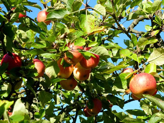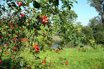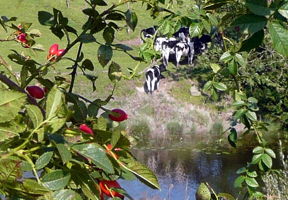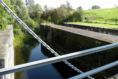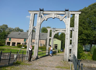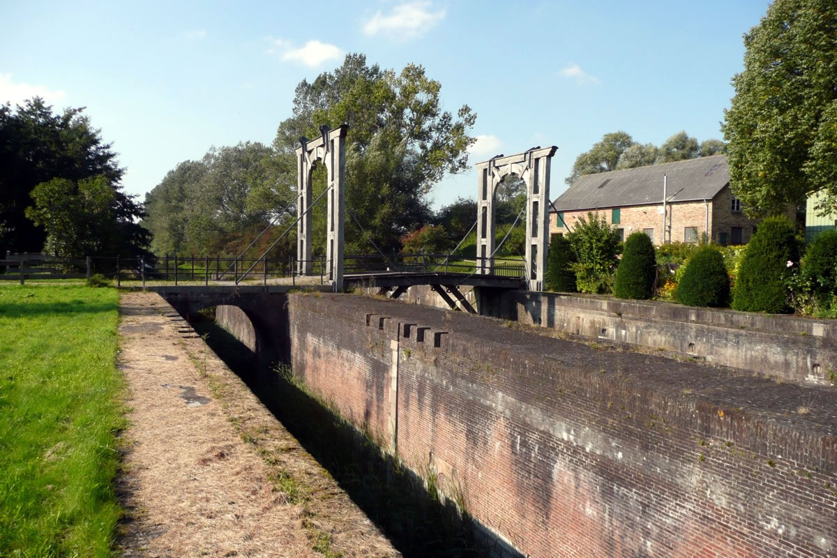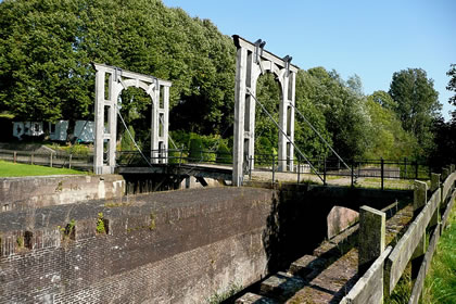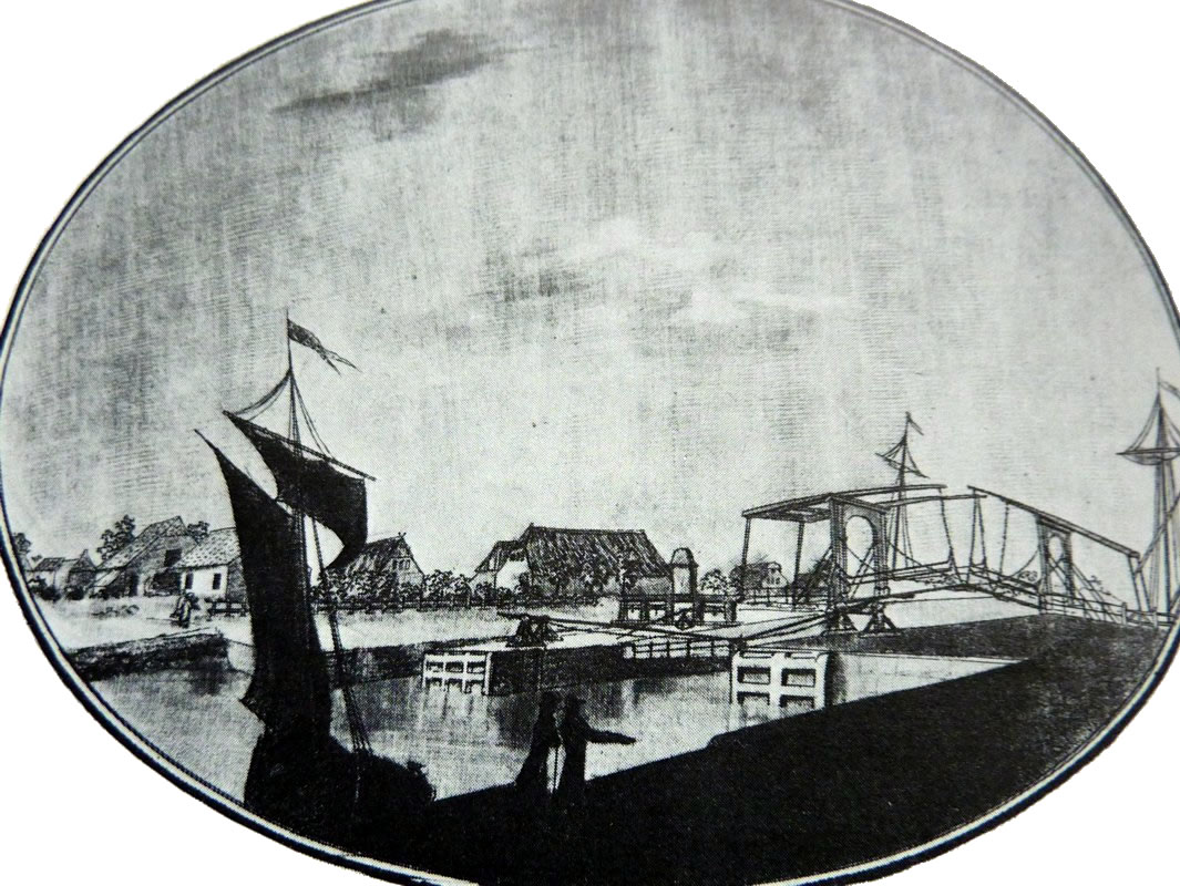Na annerthalv Kilometer Footweg weern wi endlich an de Slüüs. De Weg harr sik lohnt. De Slüüs is in enen goden Tostand. En wunnerbor nabute Hollänner Brüch överqueer den Kanal. Neben de Brüch weer en Rastplacken mit en Bank ünnern Appelboom. De laad uns to'n Verhalen in. Ünner den Boom legen riepe Appeln. De hebbt wi uns smecken laten.