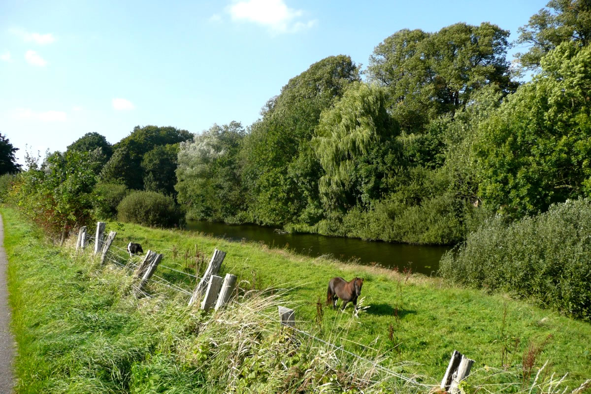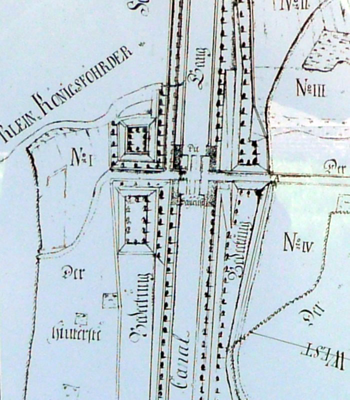 Uns Auto kunnen wi up enen lütten Parkplacken afstellen. To Foot güng dat denn up den olen Treidelpadd an dat Över vun den Kanal lang na de Slüüs vun Klein-Königsförde. Wi weern ganz alleen, blots Peer un Kööh grasen up de Wiesch nevenan. Dat Water vun den Kanal blenker in'n warmen Sünnenschien dörch dat Gestrüpp. Wi kemen uns meist vertövert vör. Un dat sull in't Mittelöller mal de bedüdenst Waterstraat west sien?