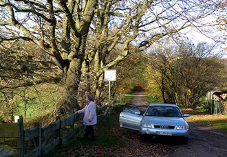 uns nescheerig. He wies in Richt vun den Woold. "Laat uns den