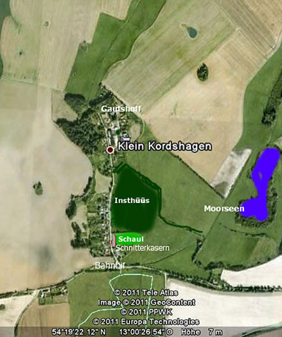 Wat hebbt wi dat hüüt licht, de Laag vun en Dörp to verklickern. Dor helpt Google Earth. Ik heff de niege Koort beten ännert, so, as dat weer, as wi dor leevten. Een lange Straat geiht vun'n Bahnhoff vun de Lüttbahn af un ennt up den Gautshoff. Up de linke Siet vun de Straat stahn de Insthüüs, ünnen rechts kümmt toierst de Schnitterkasern un denn de Schaul. De Moorseen, de ik inmaalt heff, hebbt se dröög leggt. De Lüttbahn vun Stråålsund na Bårth gifft dat nich miehr, de Straat na links un rechts ist in de letzen Johrn utbuut. To uns Tiet weer dat en Landweg mit Sandkuhlen in'n Sommer un Pütten un Matsch un Modder in'n Harvst un Vörjohr.