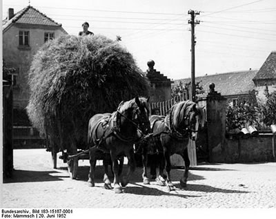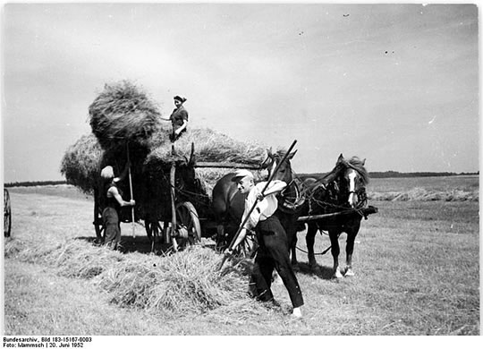 Wokeen de letzte Föhr mit Weiten na'n Hoff bröchte, kreeg de vun Fruuns schöön smückte Oornkroon. Se föhrten bi de Veranda vun dat Gautshaus vör. Alle Fruuns- un Mannslüüd stellten sik in en Krink up, veele harrn de Staakfork, de Seis orrer en Hark dorbi.