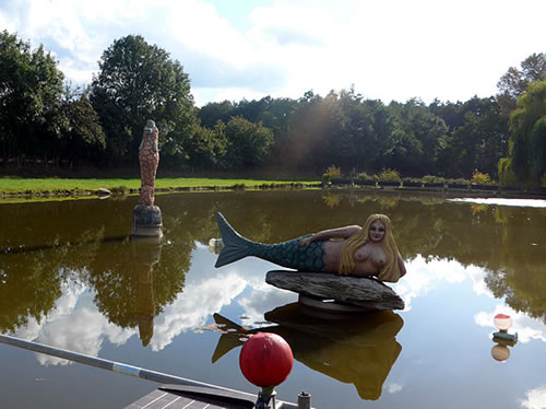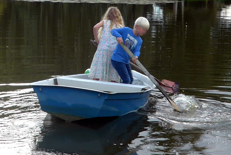 An de Nix Undine un den Watergeist Ekke Nekkepenn vörbi schippern se up den Diek. De Figuren weern vun Holt un stünnen in den Diek. Se sehgen de richtigen Geister bannig liek. N'beten bang keek Opa de Kinner achterna. De Diek weer immerhin meist 2 Meter deep. In't Water dörfen se nich fallen. De Watergeist Ekke Nekkepenn keek meist so'n beten grimmig to. He stütt sik up den Dreezack. Notfalls kunn he dormit to Hölp kamen. Undine leeg up en Boomstubben un keek to.