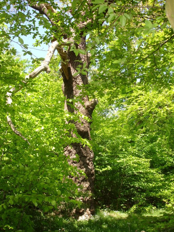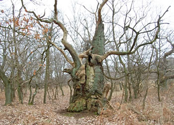 na baben. Eine olle knorrige Eik is von einen Blitzschlag so kaputtschlagen