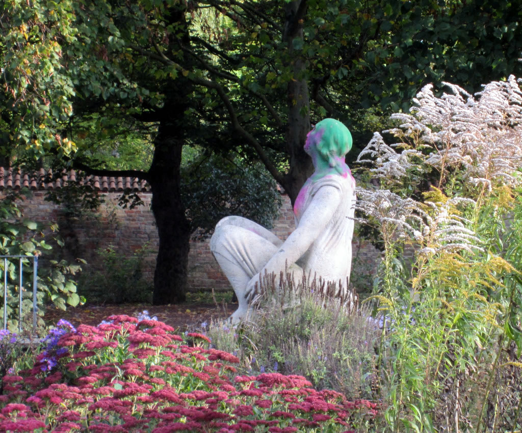 Doch dei farwbeschmeerte Frugensskulptur in dei schöne Blaumenrabatt'