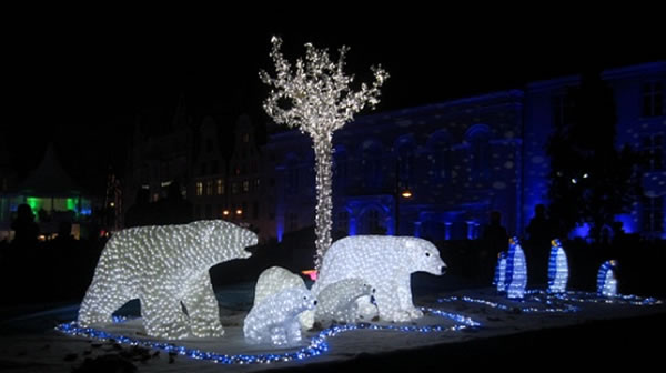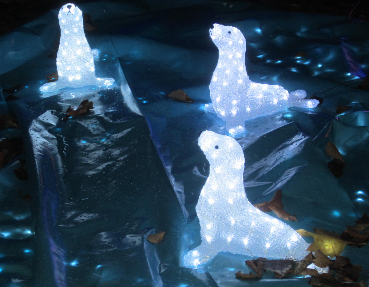 Ook dei Brunnen is nütt worrn un hett Waarergefleugel Platz gäben. Grote Lüchtblöck maaken de Plastiken ook inn Dunkeln sichtbor.