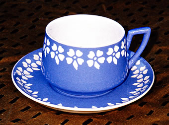 dat mien blåge Tass mit den dekorativen Bläudenrand üm