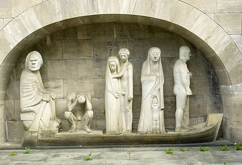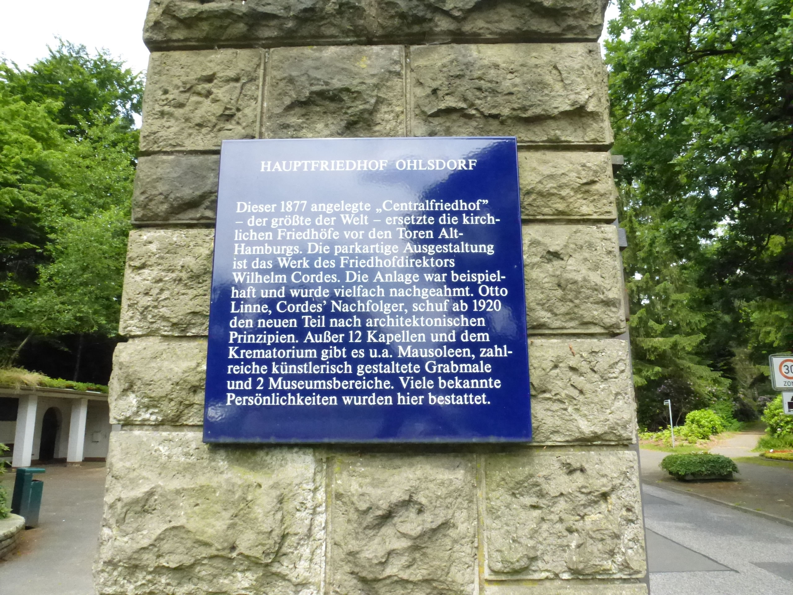 Ik harr mien Auto dorbi. Dree Fruunslüüd un een Mann, dat weer en ideale Gesellschap. Stück fohrn, Stück lopen, Stück fohrn, wedder Stück lopen, so weer dat kommodig. Dat grote Bombenopper-Mahnmal för de 40.000 Doden von de Gomorrha-Angriffe Juli un August 1943 weer de eerste Statschoon. En 5 Meter hogen Quader ut Sandsteen un binnen en Bild, ok in Sandsteen,