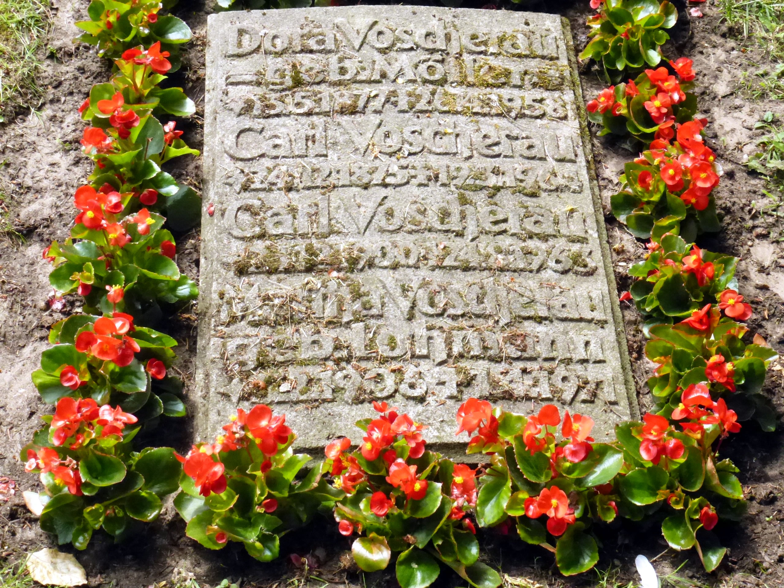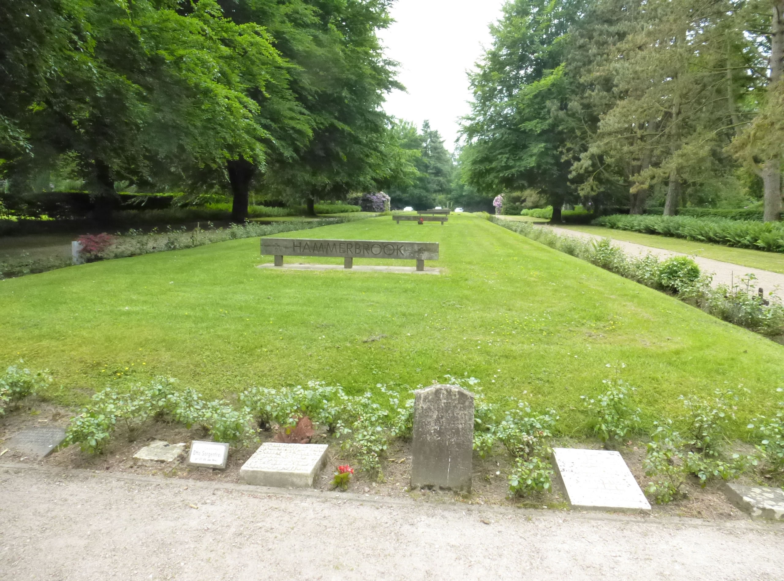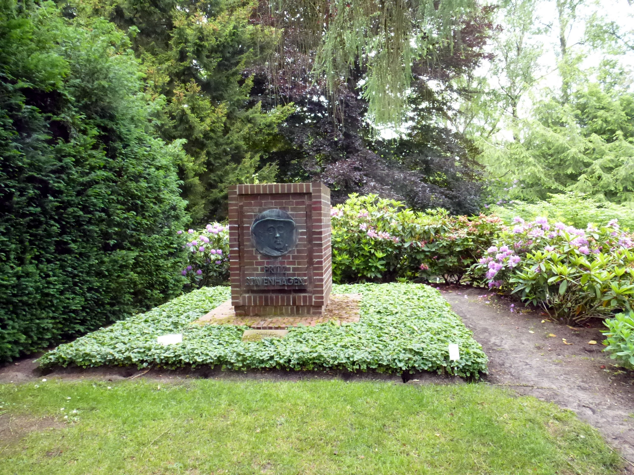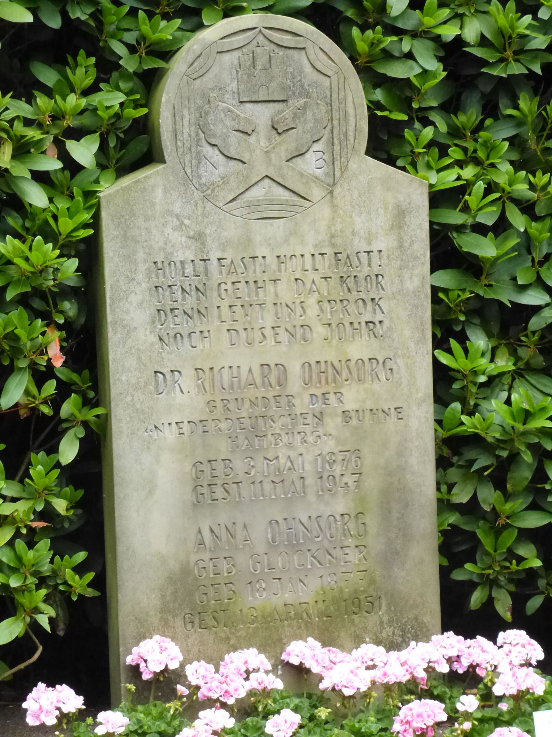 Wi wullt toletzt partout noch na de Dichtereck kieken. Dorbi hung uns al ganz scheun de Tung ut'n Hals. Dat güng nu bargop un bargdal, wi wullt al opgeven. Un denn harrn wi dat doch noch funnen! Hier legen all de Prominenten nich allens Dichter, aver doch all ut dat noorddüütsche Literatur- un Kulturleven: Edgar Bessen, Fritz Stavenhagen, Familie Voscherau (Kulturleven? Ja, dat is en Schauspelerfamilje!), Richard Ohnsorg, de olle Henry Vahl un siene Familje un ganz wichtig ok Wolfgang Borchert.