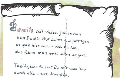 Sowat bi 50 Johren is dat woll al her, do schreev ik en Breef an unsen Breefdreger, den wi all Post-Jakob nömden. Op den Breef un op den Breefümslag heff ik keen Afsender angeven un ik smeet em hiemlich in den Breefkassen. So weer ik mi seker, dat Post-Jakob nich rutkreeg, wer den Breef an em schickt harr. Dree bit veer Weken later dreep ik Jakob bi't Inköpen in unsen Tante-Emma-Laden vun Else. Jakob is toeerst an de Kass, beten later bün ok ik mit mien Inkööp fardig un gah an de Kass. As Jakob betahlt, seggt he to Else: "Nu müch ik noch een Tafel Schokolaad." Uk disse betahlt he un reckt se na mi röver. "Worüm för mi?" "Dat weest du ganz genau!" Ik wüss dat natüürlich nich nipp un nau, aver ik harr woll en Vermoden. Jakob muss woll rutkregen hebben, dat ik de Afsender vun den Breef weer wo kunn dat blots ween? Later vertell Jakob eenmaal, dat he as Breefdreger natüürlich bald all Handschriften vun uns Dörpslüüd kennen dä, de bi em Breeven afgeven oder in'n Breefkassen smeten harrn so weer dat also. Egal, Jakob hett den Breef mit dat Gedicht vele Johren opbewahrt.
