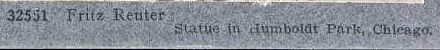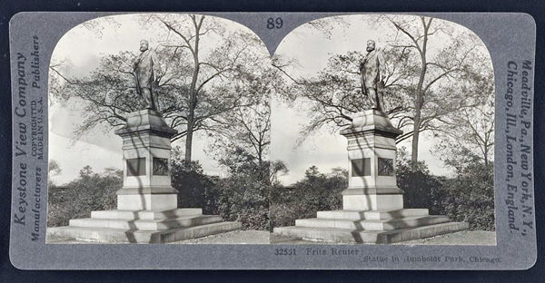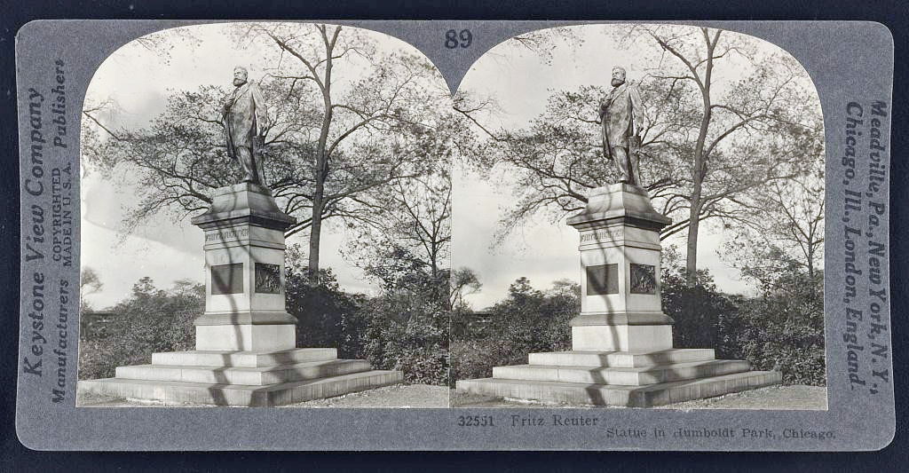 In’t „Pommersche Blatt“ von Juli 2012, Issue 73, fünn ik up dei Sieden 9/10 ’nen „Fritz Reuter Article“ von Gary Klingbeil. Hei harr ok ’n Grund, denn dei Pommersche Verein kreech von den Börger Richard Olsan ut Merrill - disse Stadt licht gaut 20 km von Wausau af — ein fien Medalljong, dat von dei plattdüütsche Gill ut Chicago stammt. Dor geef dat disse Gill twüschen 1884 un 1900 un von ehr stammt dit Schmuckstück mit den ingravierten Nåmen Fritz Reuter. Disse Ort Brosch is dörch rode Siedenbänner noch mit ’n Anhänger verbunnen un up dissen is wedder’n Bom tau seihn. Nu råden dei Lüd von'n Pommerschen Verein in Wausau, wat dei Bom mit Reuter tau daun hett, denn dei Reutersche Eikbom is in Wausau nich bekannt un sülfst dat Internet künn dei Lüd dor nich helpen. Bi all mien Niegelichkeit up disse plattdütsche Gill von vör 1900 fünn ik denn wat œwer ’n Reuter-Denkmål in’n Humboldt-Park von Chicago. Dei dütschstämmig Franz Engelsman (1859-1921) läwt as Künstler in Amerika un måkt in’n Updrach vonne düütschstämmig Börgers ’n 2,50 m grot Statue ut Bronze von Fritz Reuter. In’t Johr 1893, as in Chicago dei Weltutstellung wier, hett man den Bronze-Reuter up’n noch grötteren Marbelsockel in’n Humboldt-Park upstellt, un an’n 14. Mai keemen denn 50.000 utwannert Düütsche orrer Nåkåmen tauhop, üm bi dei Inwiehung dorbi tau sien. Dat Denkmål steiht ümmer noch an densülbigen Placken as dunnemåls, blot dei vier Bronze-Relief-Tafeln mit Biller tau Reuter sien Wark an’n Sockel würn inne 30er Johren klaut. Dei vier Löcker sünd hüt noch gaut tau seihn, denn niege Relief-Biller würn nich insett.