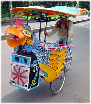 vun Günter Sohnemann Sik in en Rikscha to setten weer för mi to Anfang mit so'n beten binnern Wedderstand verbunnen. Ik harr doch twee gesunne Been un wull mi allens erlopen! Avers dat Warven un Drängeln vun de Rikschafohrers leet mi all mien europäisch Vörbehollen vergeten. De Rikschas weern hier Fohrradrikschas, nich de ganz olen ut de Koloniaaltied, de vörn an twee Stangen trocken warrt un 'neem de Fohrer löppt. Hier radelt de Fohrer un sitt achter di. Liekers: Wenn ik vörn in de Rikscha sitten un achter mi den Aten un dat Quüüchen vun den Rikschafohrer höörn dä, wo he sik de Seel ut'n Lief strampel nee, also ik keem mi reinweg vör as en Koloniaalherr. Dor föhl ik mi nich wohl in mien Huut. Liekers wüss ik, de Rikschafohrer harr en Familie un müss wat na Huus bringen, he harr sien Rikscha, för em weer dat de eenzige ehrliche Arbeit, un Almosen wull he nich. Un to dat Beleven in annere Länner höört even ok dorto, dat een de Transportmiddel utprobeert, de dor begäng sünd.