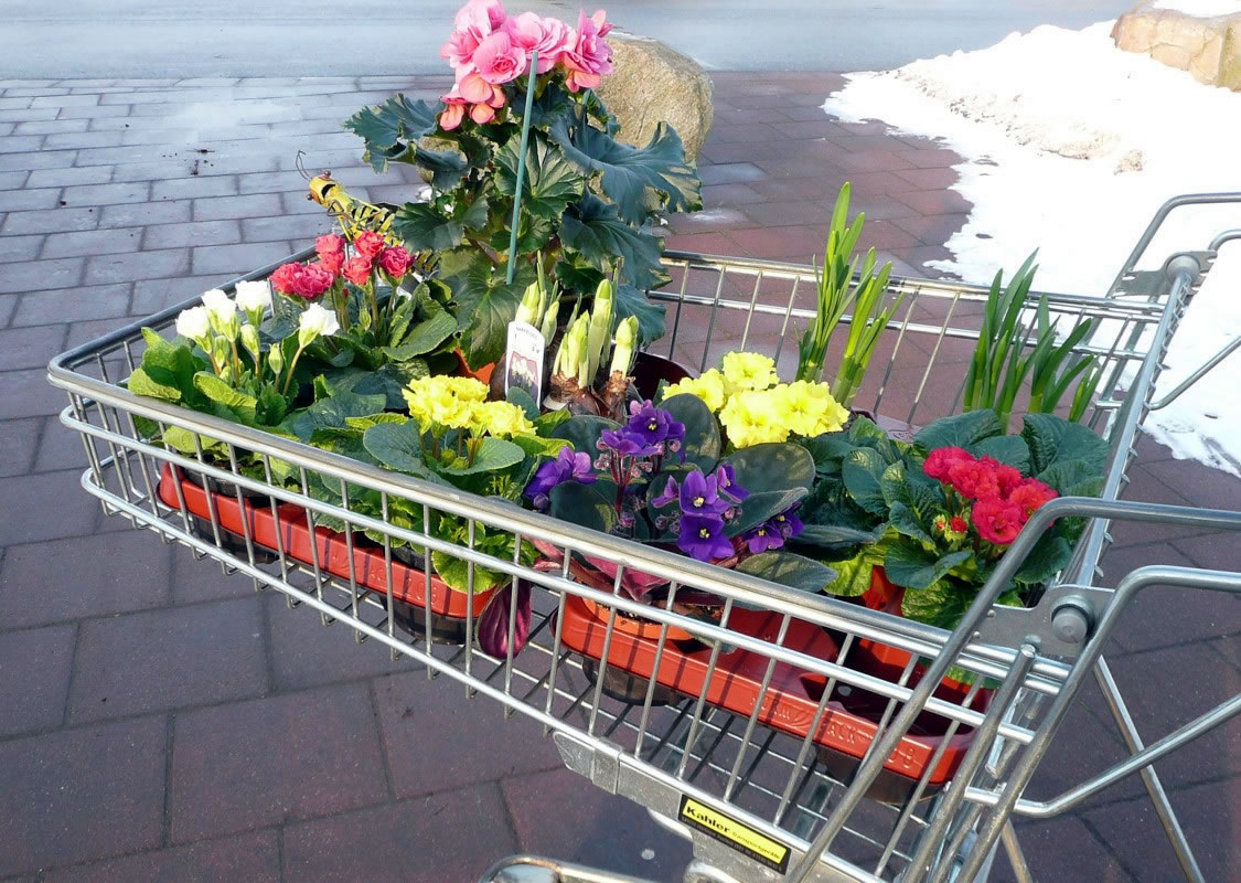 "Geern", reep se, "dor köönt wi doch ok goot to Meddag eten!" Gau heff ik se afhaalt. Bi strahlenden Sünnenschien güng de Fohrt över de Dörper na Schürsdörp. Uns' Inkoopswagen weern bald mit bunte Blomen beladen.