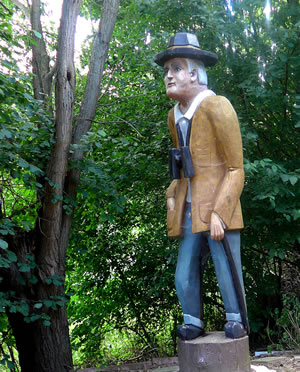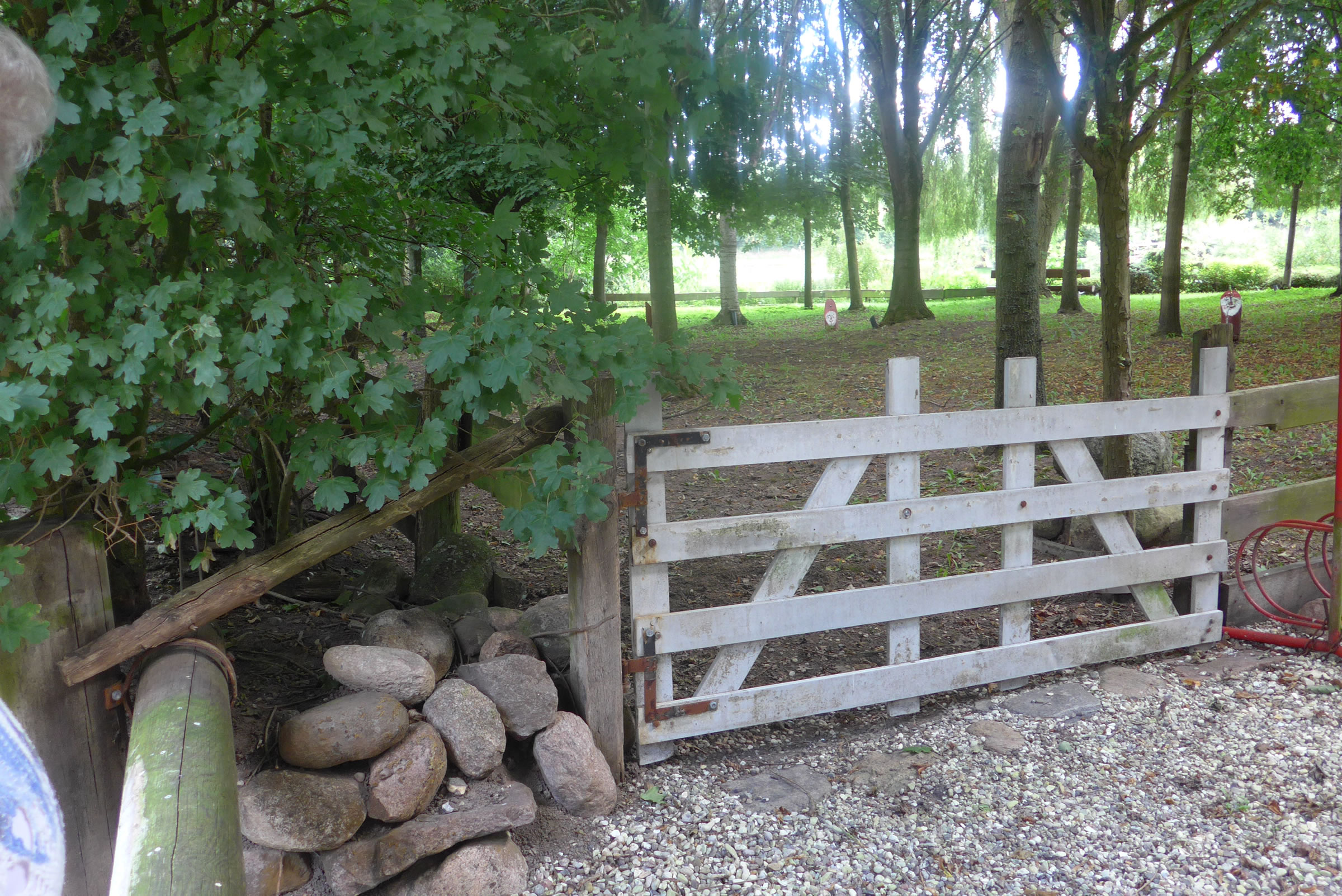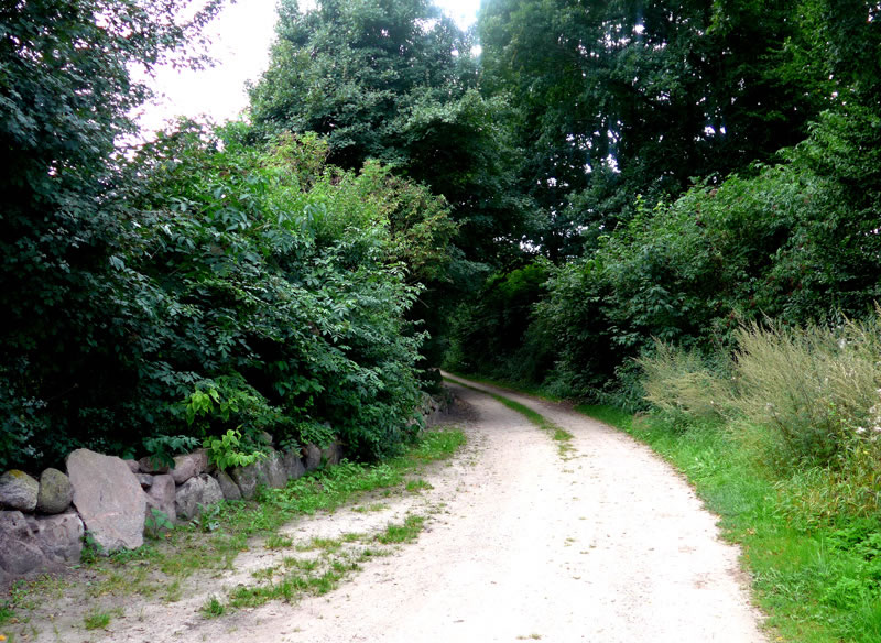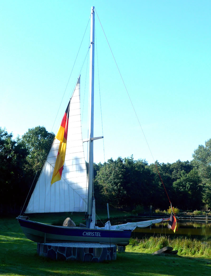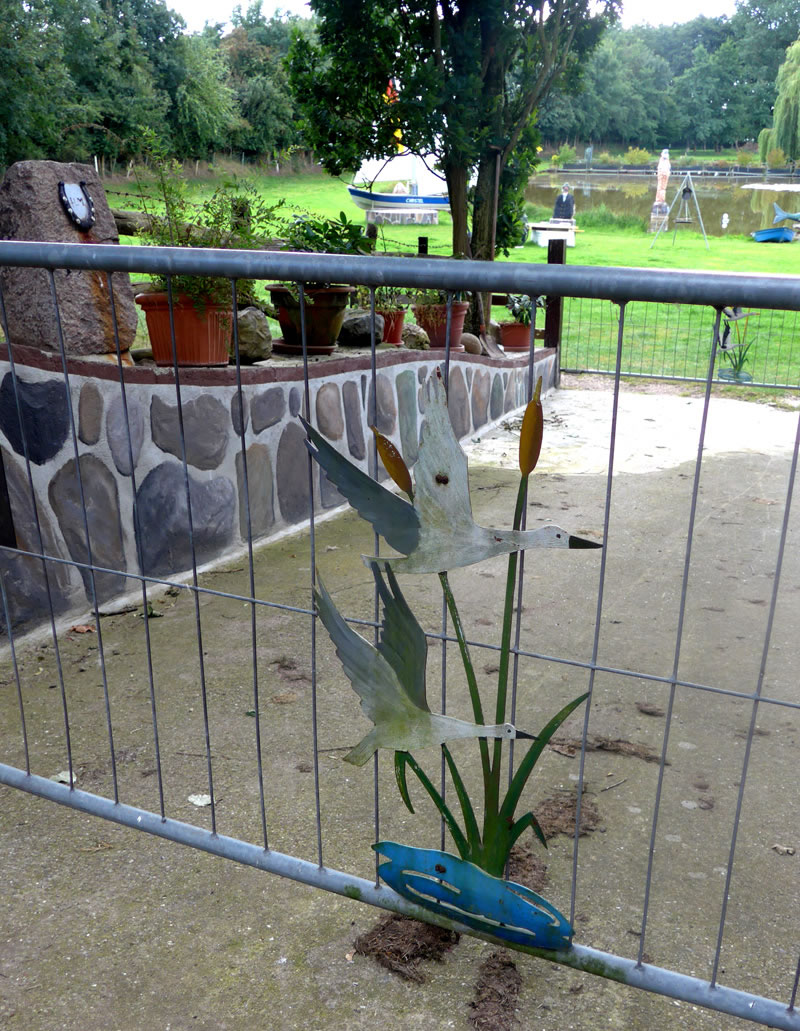 kamen. Aver wie dat so is, bumms weern wi vörbi! Wat harrn wi dor för enen smucken olen Landweg tofaten kregen! Vörsichtig müss ik dörch so allerhand Slaglöker deelwies mit Water füllt stüürn. Wi weern de eenzigen Autofohrer up den Weg. Aver dat weer so en smucken Landweg, wi kunnen uns gor nich satt sehn. Denn heff ik mi bannig verfehrt, heff mit enen Ruck dat Auto stoppt. Vör mi stünn en groten Kerl. Wull de uns verjagen? Aver ne, de Kerl weer ut Holt. Wi sünd denn eerstmal utstegen un hebbt uns den Kerl genauer ankeken. He stünn vör en Tor. Achter dat Tor weer en smucken Diek to sehn. An't Över vun den Diek stünnen noch mehr Figuren ut Holt. En Seejungfer "Undine", Neptun un noch anner Figuren. En Segelboot "Christel" leeg an Land. Genauer kunnen wi dat nich utmaken. An dat Tor stünn en Schild "Betreten und Angeln verboten!" Seker stünn de Mann mit de beiden Hunnen dorüm an dat Tor. Wi harrn dat Geföhl, dat wi in en vertöverte Welt weern. Nadinkern güngen wi torüch na uns Auto. Wokeen gehöör düsse Diek, wer harr dat allens upbuut? Dat müssen wi rutkriegen. Langsam föhren wi den verwunschenen Weg wieder. Dat Water vun den Diek schemer ümmer dörch de Büsch. Up en Wisch grasen swattbunte Kööh. Wi hebbt noch wedder anhollen, kunnen nich noog kriegen vun de schöne Natuur. Up den Schooh vun mien Fründin harr sik en Grashüpper daalsett. Wiet un siet weer keen Minsch to sehn.