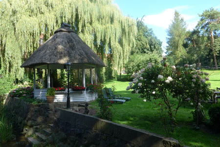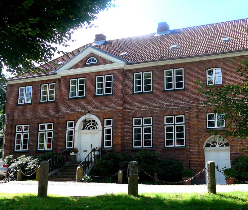 De Fru keem up mi to un fraag: "Suchen Sie etwas?" De Graf hett ut dat ole Möhlenhuus an de Schwartau en Hotel mit Ferienwahnungen buut. Wi dörfen uns den Park achter sien Huus ankieken. De leeg an de Schwartau mit enen wunnerboren Goornpavillon. In de Twischentiet hett de Graf de groten Rasenflächen meiht. Sien Höhner lepen achter em her.