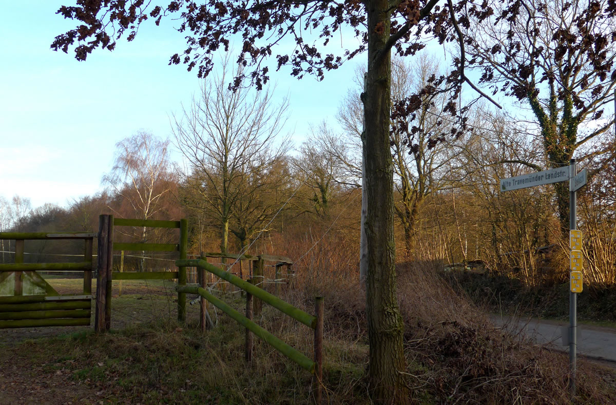 na Krüüzkamp funnen wi den Wegwieser "Alte Travemünder