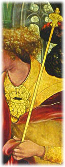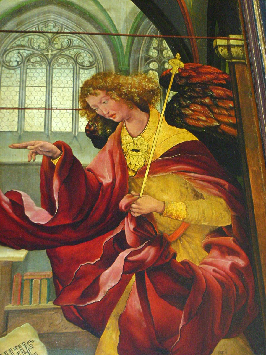 Dat schient, as wenn Maria trüchwieken deit vör den himmelischen Storm, de up se dalkümmt. Se hett sik verfehrt, liggt en beten up ehr folden Hannen un böögt sik na achtern. Ehre Oogen sünd slaten, villicht noch vun dat Beden, vun dat Versenken, un een kann annehmen, dat se den Engel gor nich süht, aver sien Botschap as en binnersietig Vision beleven deit.