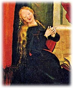 Maria ehr Oogen sünd noch slaten, aver ehr Ohr, dat hett se den Engel todreiht. Se is ganz Ohr, un dor is en grade Streck vun den Engelsmund över sien Hand jüst up dat Ohr linkssiet.