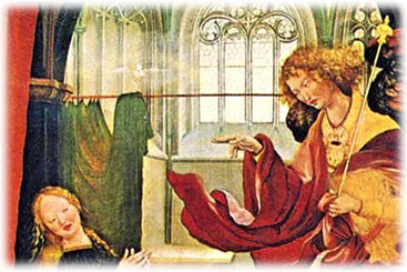 En bannig Swung geiht vun rechter Hand baben na links ünnen dörch dat Bild. In de fromm Stillnis is en Stormwind inbraken. De Kleder vun den Engel wiest dat up, se sünd noch in Gang un springt nipp un nau Maria an, so as de Hannen, de gliektiedig mit ehr tosamenleggt Finger Segen utdrückt. Blots dat Gesicht vun den Engel Gabriel is still un in sik kehrt up de junge Deern richt. Dat süht ut, as wenn de Engel över dat deep Geheimnis vun Gott sien Botschap wunnerwarkt.