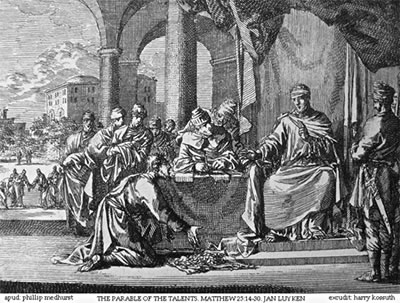 Dor is de junge Mudder mit veer Kinner, de vun enen besapen Autofohrer dootfohrt worrn is. Kann een dat verstahn? Kann een dor överhaupt noch Globen hebben? Ik meen, dat is de Laag vun den drütten Mann. Aver he hett sik nich ganz vun den Gloven afwendt. He hett pütscherig upbewohrt, wat he övernahmen hett. Nee, ganz ahn Gloven un Religion geiht dat nich. Dat gifft en höger Wesen, un de christlich Grundlaag, de mutt bestahn blieven. "Ik kunn mit Jesus Christus egentlich nich klor kamen, aver de christliche Bedriev, de mutt wiederlopen. Wat sall een anners maken: Ik laat mi christlich truun, mien Kinner mütt döfft warn, ik schick se ok to 'n Konfirmandenünnerricht, ik bliev ok Mitglied in de Kark un betahl mien Karkenstüür." So stellt he sik up den christlich Standpunkt, man sienen Globen, den wickelt he in sien Snuufdook und bewohrt em up. Aver dor is Jesus nich mit inverstahn. Ja, wenn he em aflehnen wörr un em den Globen vör de Fööt smieten wörr, dennso weer dat en klor Saak. Man nu höllt he sik de Achterdöör apen: investeern wull he nix, aver de Brüüch ok nich afrieten. Un so is dat bi vele Minschen hüüttodaags, ja sülvst bi de Kark sünd all up dat Bewohren ut. Ok wi hebt uns Talent, dat Gott uns geven hett, inbuddelt. De Karkengebüden sünd all fein up nie maakt, dat hett keen Tiet geven, wo in Westdüütschland de Karken un all de Kunstwarken so goot in 'n Schuss weern. Aver de Lüüd bekieken se sik blots as Museum, för de Pleeg vun den Globen, dor gaht se nich to Kark. "De Gottsdeensten, dat is allens olen, vörbigahn Kraam, de nicht in uns Welt passt!" Und wi, de mit de Kark verbunnen sünd, wi hollt dor nie gegen un hebbt ok nich den Moot, mit unsen Globen wat Nieges to wagen. Wi blievt bi de olen Erfohrungen un Formen un sekert uns af und kriegt nich den Dreih. De Upgaav, de de Minschen vun ehren Schöpfer mit up 'n Weg kregen hebbt, is, dat wi uns "Talenten", uns rieke Gaven, de Gott uns anvertruut hett, insett in ene Welt, de dat so dringend nödig hett un Teken to 'n Höpen up en beter, minschlich Leven bruukt.
