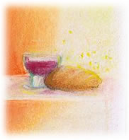 Un in de Mitt vun't Bild, op en Disch: Brot un Wien, Abendmahl.
