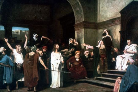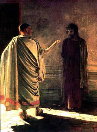 ![]() Jesus un Pilatus: Wat is Wohrheit? Bild vun Nikolei Ge Jesus seggt to ehm: "Ik bün de Weg un de Wohrheit und dat Leven. Nüms kümmt to'n Vadder denn dörch mi." Tweimaal kaamt se an dissen Dag tosamen, de Gröön-Donnersdag,