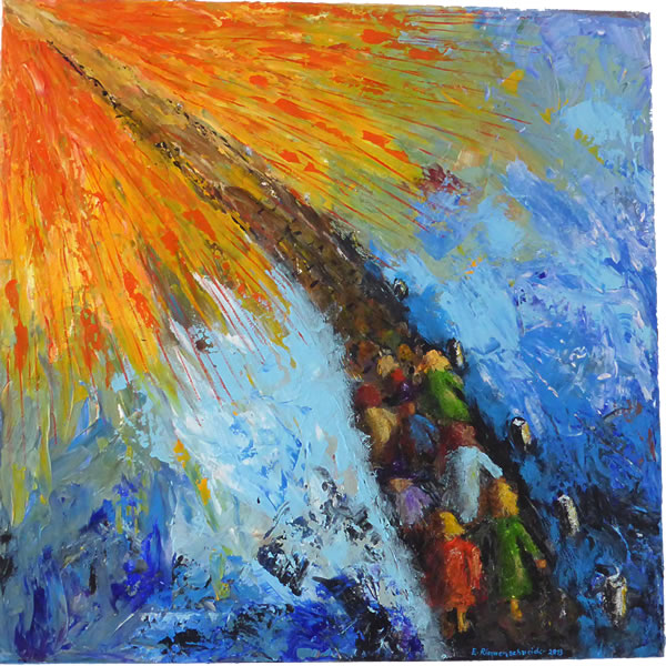 Passion 2021: Kiek eins, wi gaht rop na Jerusalem, Lukas 18, 31 Vullendt. Allens warrt vullendt. En Minschenstroom treckt in't Licht... jedereen denkt an sik. Jesus hett nich an sik dacht. Laat uns eenfach mit em gahn. |