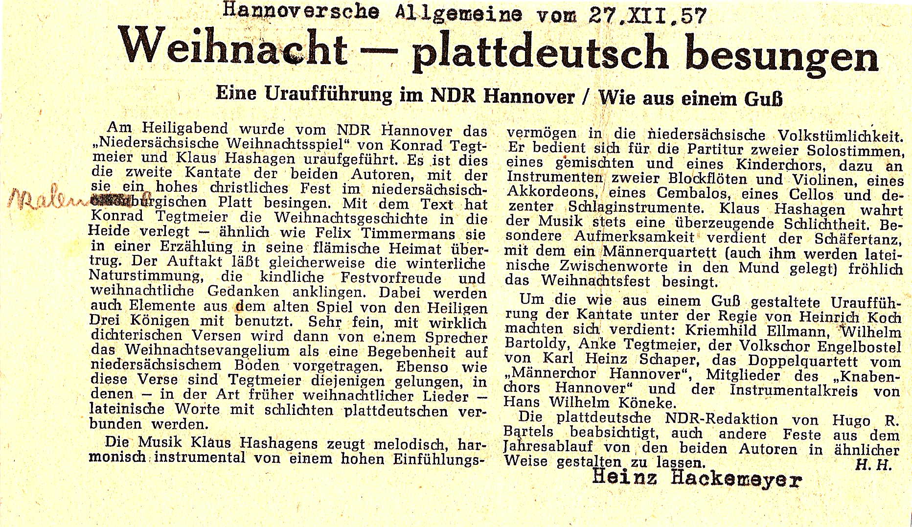 Düsse Kantate in Kalenberger Platt woor an'n 24.12.1957 mit