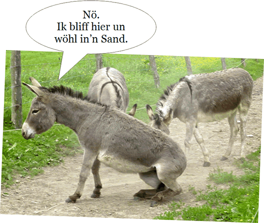 Denn wölter se sik in den Sand. All veer Been na baben!