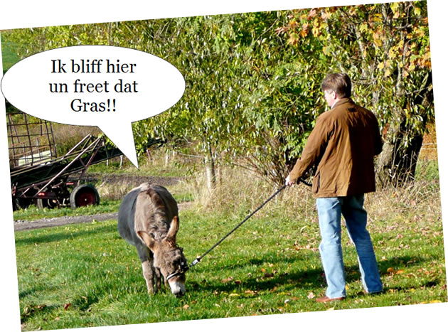 Dat letzt Mal heff ik Juuch vun mien Ümtoog up de anner Wisch vertellt. Vörher kregen wi en Halfter üm den Kopp.