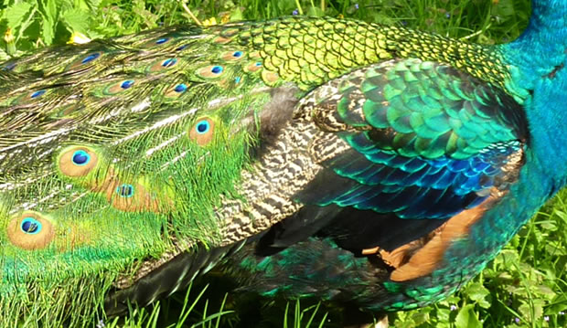 Wat harr he för bunte un smucke Feddern! De glitzern in de Sünn. Up jede Steertfedder weern Ogen.
