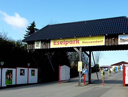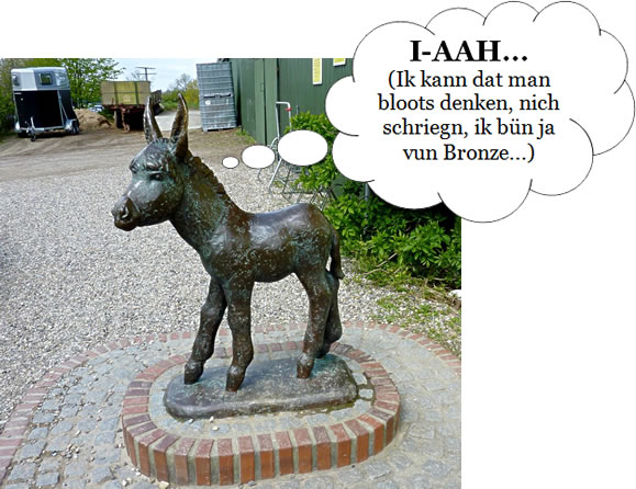 An dat groot Door steiht vun uns en lütt Evenbild, en Bronze-Esel.