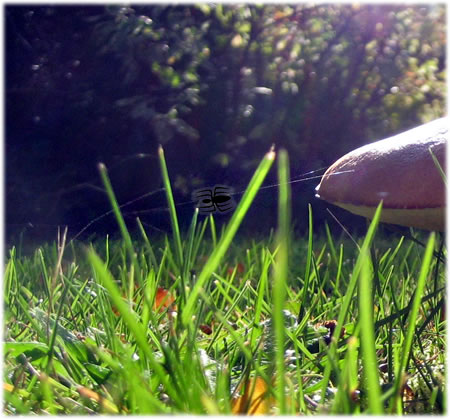De Spinn, de sett ehr Spinnennett vun'n Poggenstohl sin Hoot in't Gras hendaal.