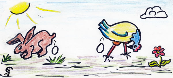 Oaber noch een Karakterbudel beseeten de Ur-Ur-Urgrootöllern van de vandoagigen Hööner see ween över de Moaten ovgünstich. Ovgünstich up de Oosterhoas de kunn koakt Eier lärgen! Wenneer he dat ok blods an Oostern kunn oaber he kunn dat. See as Hööner knoieten un meuden sükk Dach föör Dach mit de Eierlärgeree rüm mennichmoal ween dat liekers goar twee an een Dach, wenneer een Höönerwiefke heel fliedich bi de Produktschon wee.