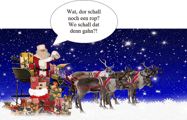 ok för unsen Wiehnachtsmann! Rasch weer över dat Job-Center en Knecht söcht worrn en Stevelknecht. Düsse Stevelknecht mutt nu ja nu ok noch mit op den Sleren rop un bi jeed Tour mitfohren. Düsse Keerl bruukt je ok noch veel Platz op den Sleren, de ja för de Geschenken dor ween mutt. Nu in noch weniger Platz op den Sleren für de velen, velen Geschenken för de leven Kinner op de Eer un de Wiehnachtsmann mutt dordörch ok noch bannig veel mehr Touren vun sien Wiehnachtshütt to de Kinner maken un för grote Geschenken is faken keen Platz mehr, düsse Geschenken blievt denn stahn för ... ja, villicht för de neegsten Wiehnachten.