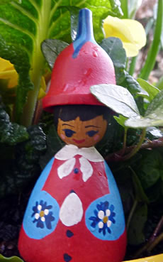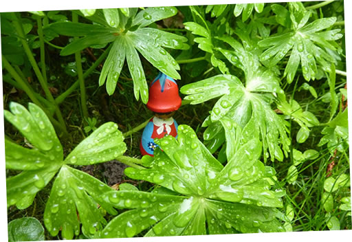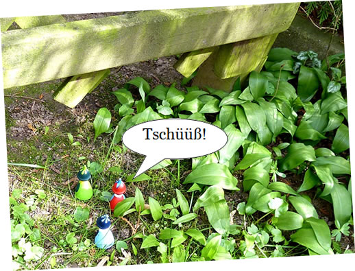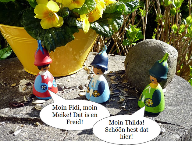 Ik güng denn wedder na mien Wahnung. In den Goorn weer allens in de Rehg. De Fru kunn tofreden ween. Vör mien Wahnung geev dat en groot Överraschen. Twee Blomenelfen kemen mi in de Mööt. Meist weer ik in Vagelschiet pett. Ik kunn noch jüüst ropen: "Passt up un pett nich in de Vagelschiet!"