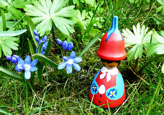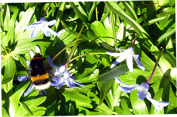 Dor höör ik dat Brummen vun en Hummel. Wull de wedder wat vun mi? Aver ne, se sett sik up en Blausteern. För den dünnen Stengel weer se meist to swoor. Se müss sik up en Winterlingblatt stütten.